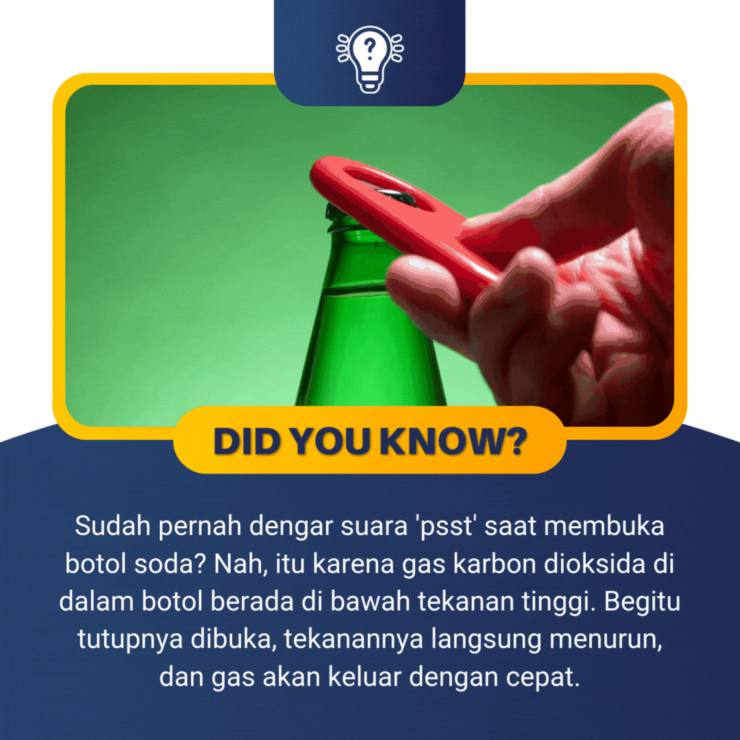 Saat membuka botol soda, kamu mendengar suara 'psst' ketika gas karbon dioksida keluar. Ini terjadi karena di dalam botol tertutup, gas berada di bawah tekanan tinggi. Saat tutup dibuka, tekanan menurun, dan gas dengan cepat keluar.
